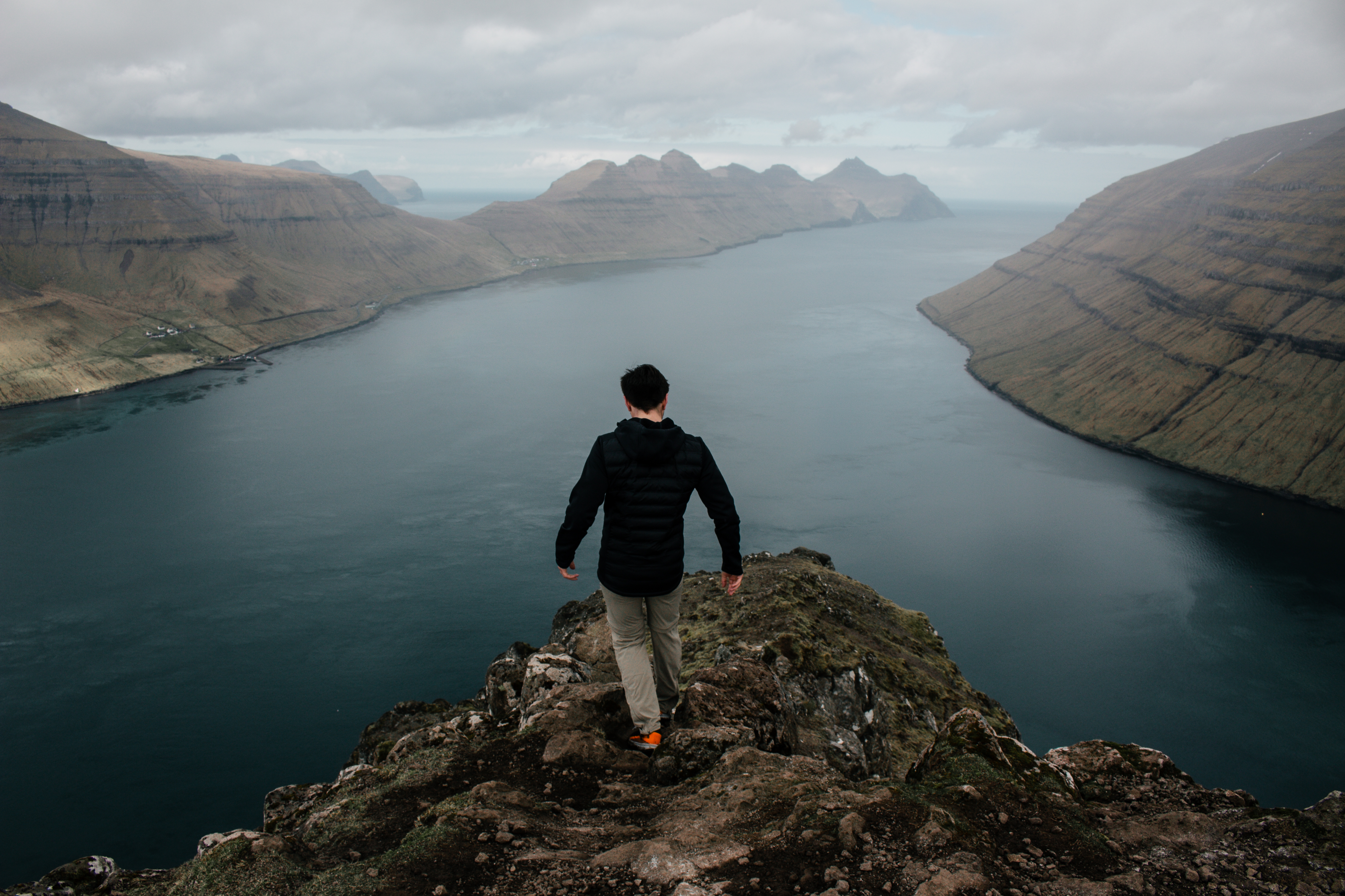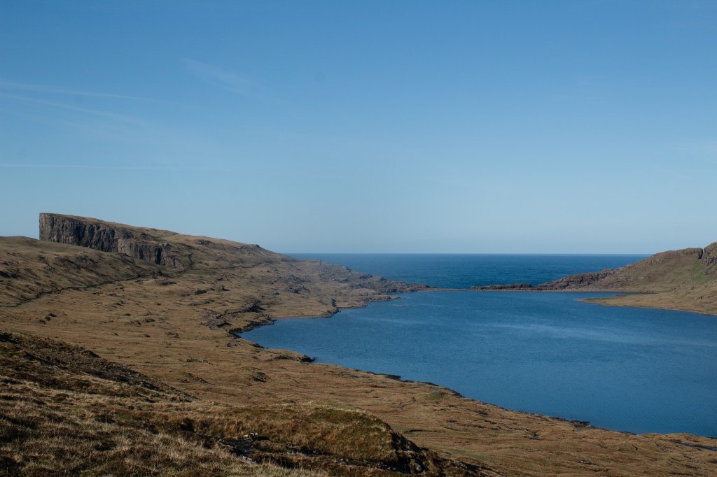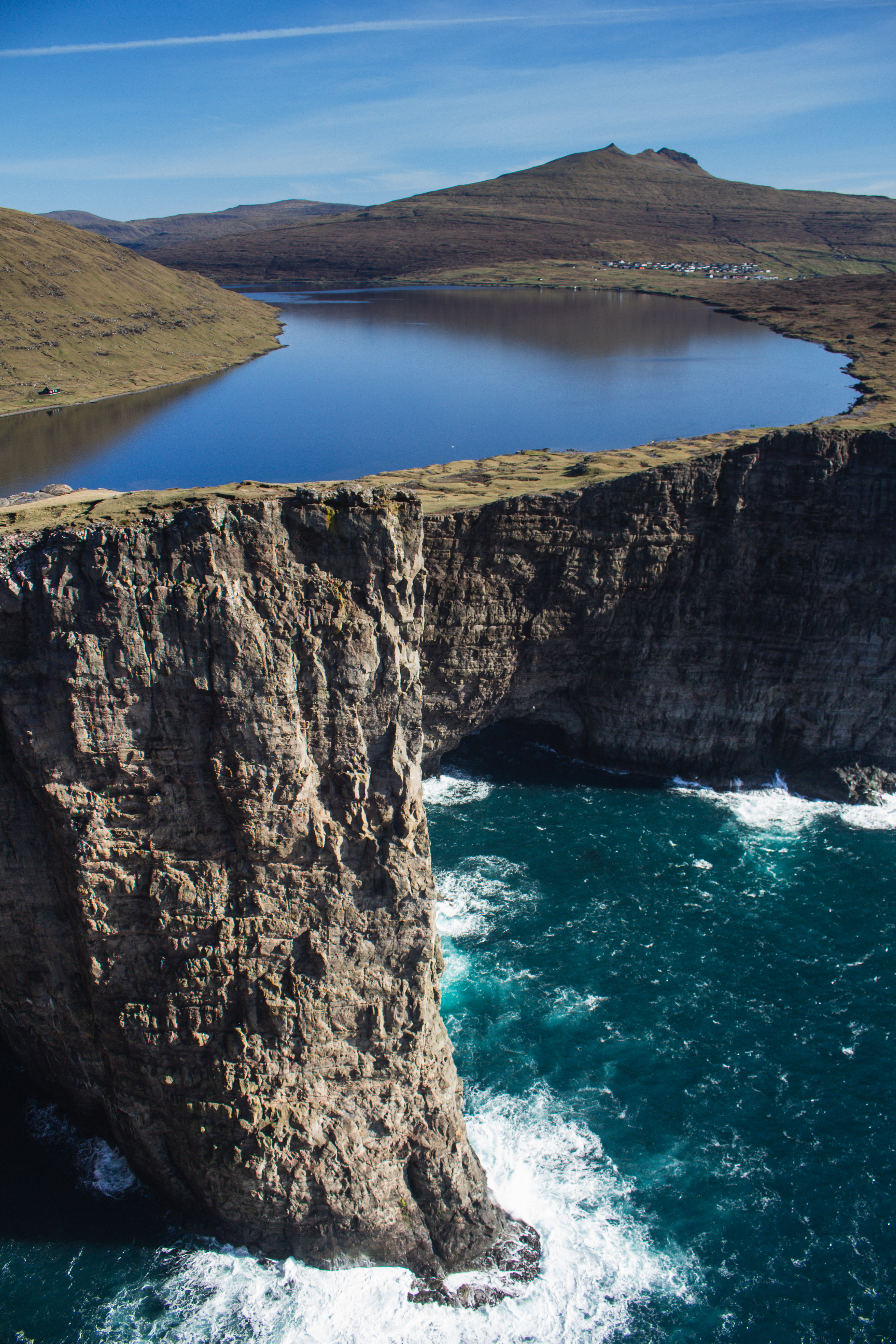 At the end of the trail, you arrive on a cliff near the Atlantic Ocean. From there, if you turn back, you will have a breathtaking view over the lake, and, it gives the illusion that the lake is hovering above the water. You can also continue the walk a bit further to Bøsdalafossur waterfall a bit down the cliff, which is also worth the walk.