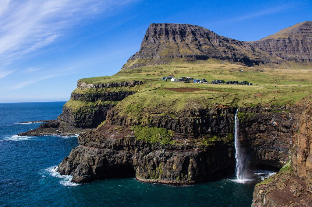 A key attraction is Múlafossur Waterfall. Cascading directly off the cliffs, it creates one of the Faroe Islands’ most iconic views.