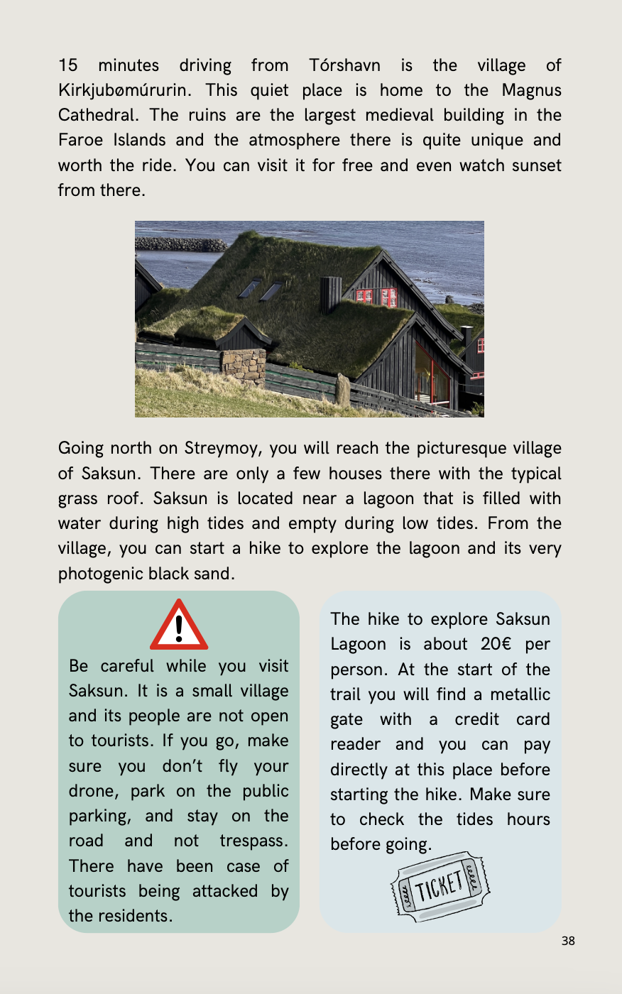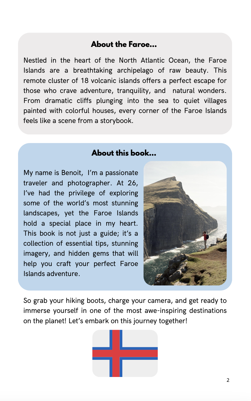 Are you planning a trip to the Faroe Islands? This guide is made to help you prepare your trip and experience the most of the Faroe Islands. General informations, hikes, itinerary and points of interests are all listed in there. This format is easy to use on a phone or tablet and is convenient to use on the go. It will also be updated when new informations are available and you will automatically receive the new version. With more than 50 pages of content, this is the best tool you can get for your next trip!