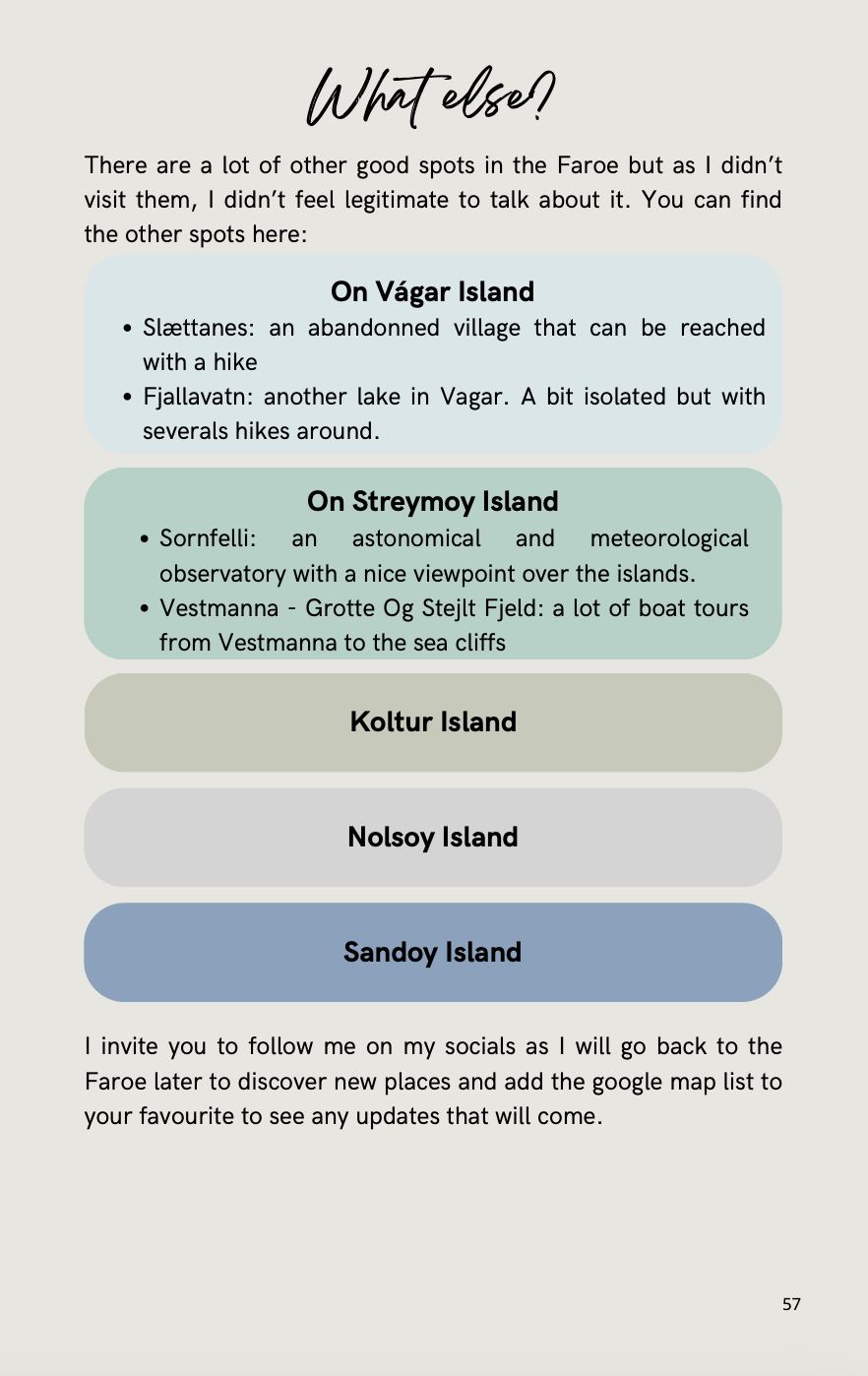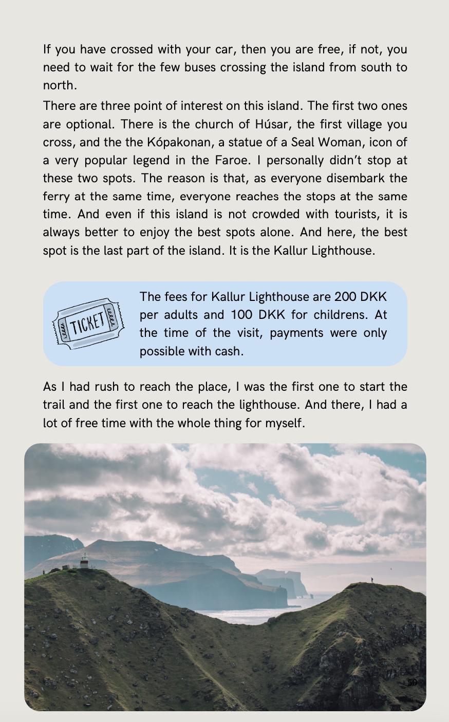 Are you planning a trip to the Faroe Islands? This guide is made to help you prepare your trip and experience the most of the Faroe Islands. General informations, hikes, itinerary and points of interests are all listed in there. This format is easy to use on a phone or tablet and is convenient to use on the go.